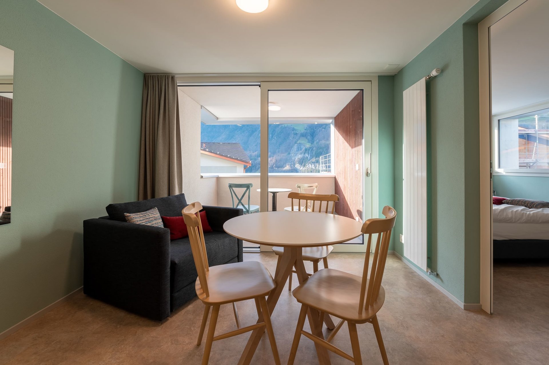 30 qm für 2 Personen, rollstuhlgängig, mit Küche und Balkon. Verbindungsmöglichkeiten mit Doppelzimmer